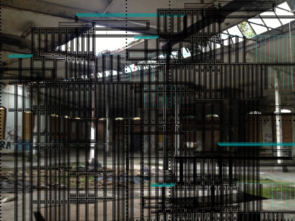 Der ehemalige Lokschuppen erfährt während der Austellung eine akustische Rekursion. Eine Raum-im-Raum-Installation, die sich aus zwei Audioschleifen der visuell abstrahierten Daten des "Ursprungsraums" ergibt. Die Übersetzung seiner Bildinformationen (Pixel für Pixel nach Kontrast und Farbwerten) in Töne ergibt die Komposition.