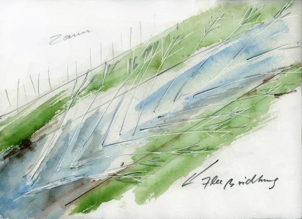 ![]() Carlotta Brunetti „Flußrichtung“ Meine Arbeit für diesen Ort im Bach heißt „Flußrichtung“. Pointiert zeige ich mit weißen Baumschößlingen die Richtung an, in die der Bach fließt - Richtung Isar nach Osten. Die weiß bemalten Schößlinge treten mittig im Bach zusammen und zeigen die Richtung an. Sie bilden ein loses Geflecht und sind auch gleichzeitig ein gewisses Hindernis für die Fließrichtung. Das Hindernis wird unterspült und bei starkem Wasser evtl. sogar weggespült oder begradigt. Der Fluß oder der Bach zeigt den Fluß des Lebens an. Wasser ist Leben. Leben besteht aus Hindernissen. |