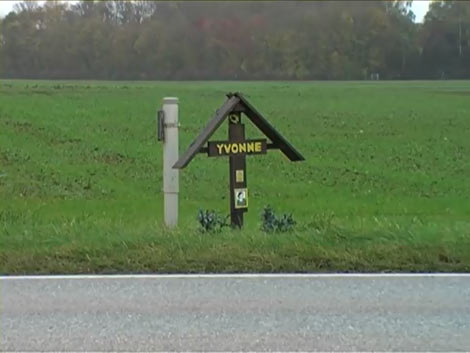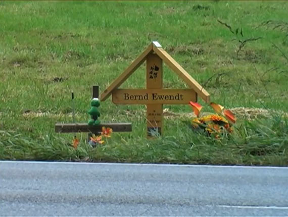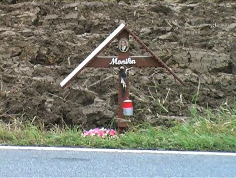 Man fährt eine Landstraße entlang. Plötzlich erscheint rechts am Fahrbahnrand ein Kreuz als Zeichen des Gedenkens an einen Menschen, der an dieser Stelle tödlich verunglückt ist.