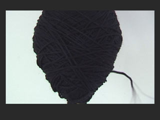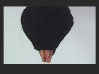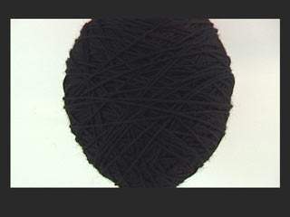 Während der schwarze Wollfaden langsam von dem Objekt abgewickelt wird, verändert sich nicht nur die Form und die Kontur des Objektes, das Bild erinnert auch an eine sich auflösende Zeichnung. Wenn das Innere des unbekannten Objektes stückweise sichtbar wird, werden Assoziationen zu den verschiedensten Inhalten geweckt.