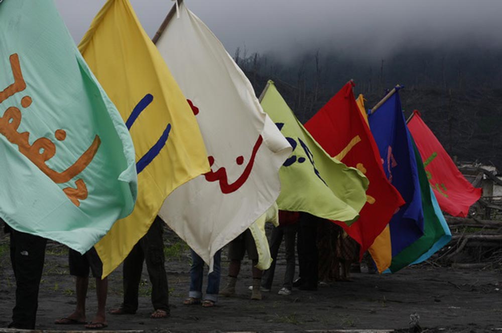 Arahmaiani Feisal (geb. 1961, Indonesien) "Crossing Point II" ( 9`10, 2013) "Crossing Point" ist aus einer Performance auf dem indonesischen Vulkan Merapi wenig nach dessen Ausbruch 2010 entstanden. Große Fahnen, die in ihrer intensiven Farbigkeit die zerstörte, verbrannte Oberfläche des Berges transformieren, werden von verschiedenen Akteuren geschwenkt. Die Schriftzeichen auf den Fahnen sind mal Sanskrit, mal Indonesisch oder Thai. Sie bezeichnen große Konzepte des Daseins wie "Heimat", "Tod" und "Gerechtigkeit". Sie weisen, so die Künstlerin, "durch ihre Universalität, die durch die Unleserlichkeit der wehenden Fahnen noch verstärkt wird, auf den Respekt gegenüber einer pluralistischen, vielseitigen Weltordnung" hin. |