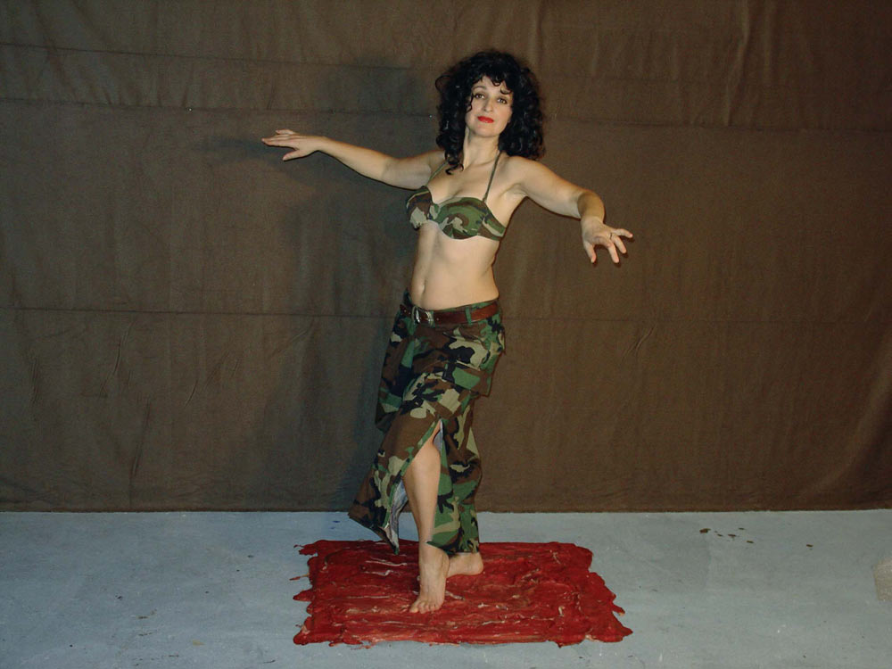 Adidal Abou-Chamat: „FLESHDANCE“, DV Video, 3.45 Minuten, 2005 In dieser Arbeit tanzt eine Bauchtänzerin im militärischen Camouflage Kostüm zu arabischen Liebesliedern auf einem Teppich aus rohem Fleisch. |