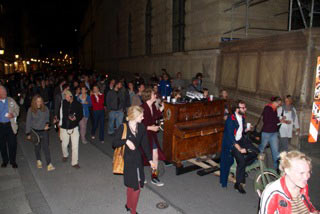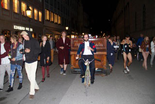 Wenn Kultur immer weniger Interesse erfährt, so muss man dem mit hartem Geschütz entgegenwirken. Mit einem Panzer auf den Straßen Münchens. Das muss sich Felix Kruis vom Künstlerkollektiv „What You See Is What You Get“ gedacht haben, als er den Kultur-Panzer erfand. Der Kulturpanzer ist ein multifunktional umgebautes Fahrrad, das von ihm gefahren und bespielt wird. Ein Klavier ist gewichtiger Bestandteil des Panzers, getragen durch einen verstärkten Metallrahmen und Rädern. Eine „Kanone“ braucht dieser Panzer natürlich auch: einen Beamer, der einen Stummfilm auf öffentliche Fassaden projiziert, live begleitet am Klavier. Diese Projektionen spiegeln auf absurde und surreale Weise die Auswüchse des Kapitalismus. Der preisgekrönte Stummfilm (1. Platz Filmfest Bayreuther Dialoge) heißt „Bubbles“, denn eine eiskalte ausbeuterische Textilfabrikbesitzerin im Körper eines 10-jährigen Mädchens bereichert sich an ihren Arbeitern, um ihrer Sucht nach Seifenblasen nachkommen zu können.